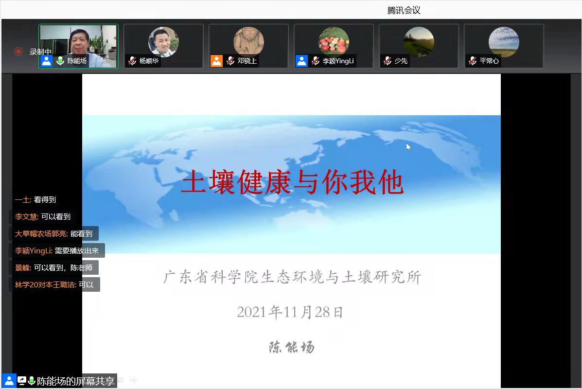 在2021年11月28日,世界土壤日到來(lái)之際,作為世界土壤日系列活動(dòng)之一,中國(guó)土壤學(xué)會(huì)科普工作委員會(huì)主任、廣東省科學(xué)院生態(tài)環(huán)境與土壤研究所研究員陳能場(chǎng)博士受邀給土壤健康和覆蓋作物交流微信群線上做了一個(gè)題為“土壤健康與你我他”科普?qǐng)?bào)告。