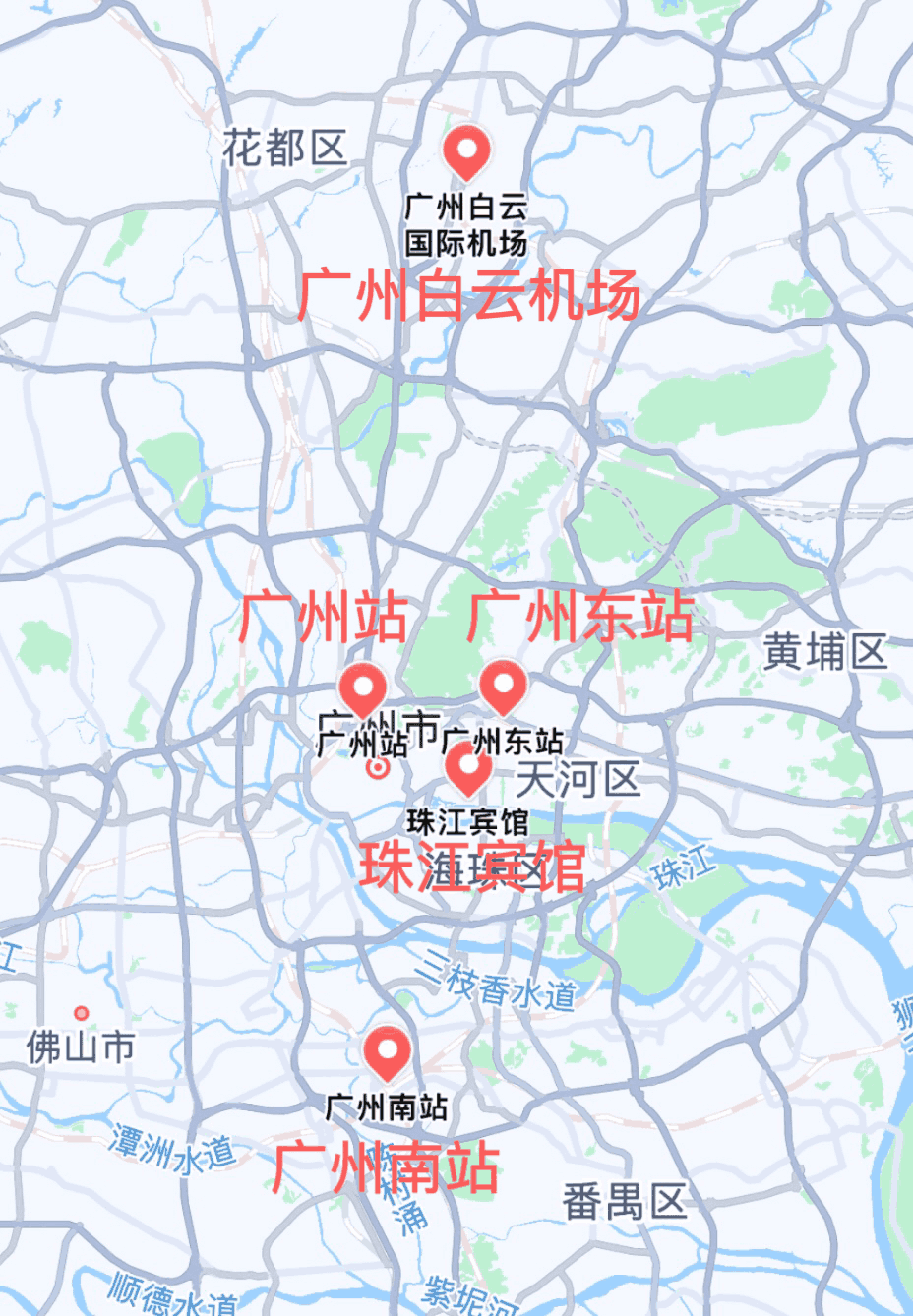 ⑤廣州站→珠江賓館:約9公里,地鐵5號線。廣州站乘地鐵5號(黃埔新港方向)到“五羊邨站”下車,步行1.1公里到賓館。廣州站乘出租車到賓館約35元。